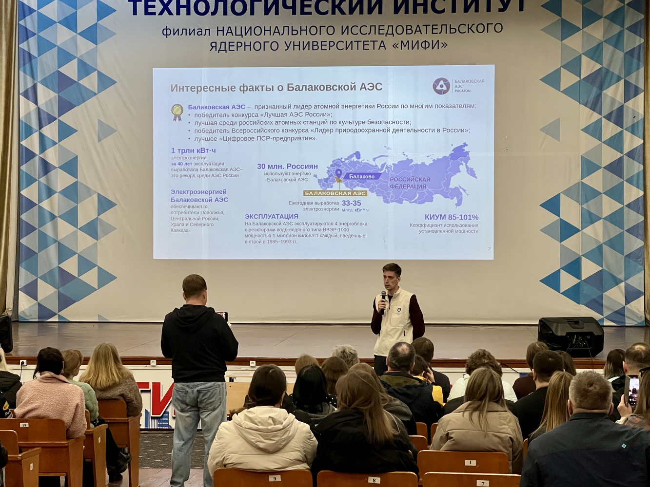 От имени кадровых партнеров перед собравшимися выступили представители Балаковской АЭС и БФ АО "Апатит". Специалисты данных предприятий озвучили информацию о прохождении производственных практик студентов БИТИ, рассказали о значимости получения профильного образования для трудоустройства и дальнейшего карьерного роста, а также о действующих программах поддержки молодых специалистов.