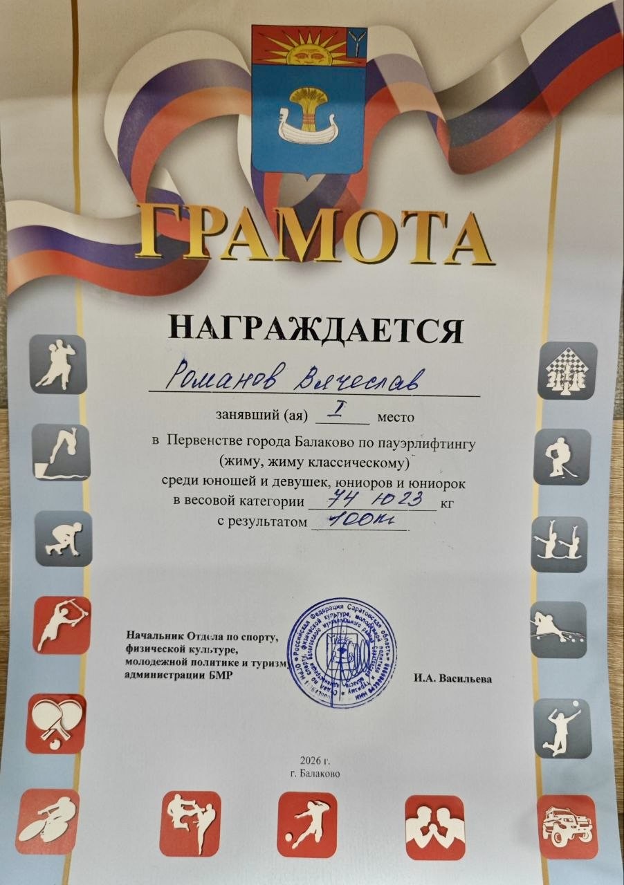 16 апреля 2026 в СК «Спортэкс» прошло Первенство города по пауэрлифтингу. Студенты состязались по жиму и классическому жиму. В своей весовой категории (юноши до 23 лет), с результатом 100 кг, первое место занял студент БИТИ НИЯУ МИФИ Романов Вячеслав.