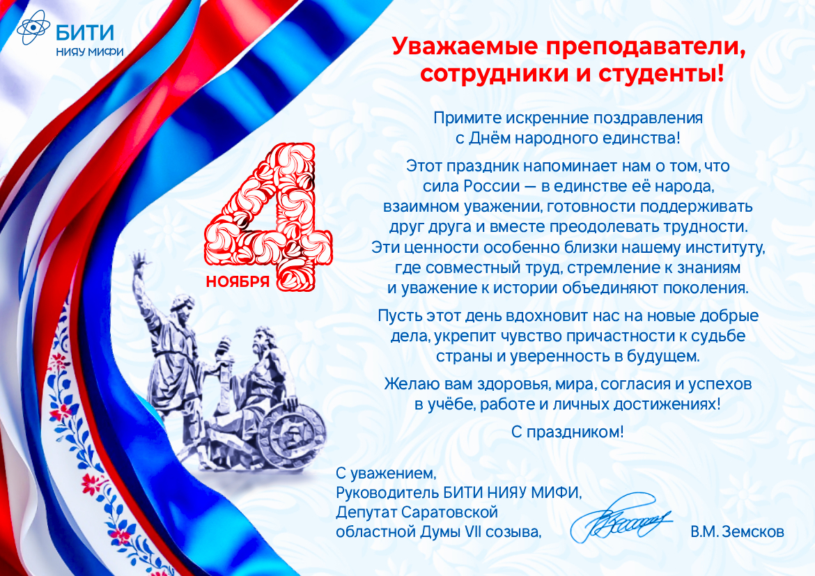 Руководитель БИТИ НИЯУ МИФИ В.М. Земсков поздравляет преподавателей, сотрудников и студентов института с Днём народного единства! 04.11.2025 Просмотров: 282