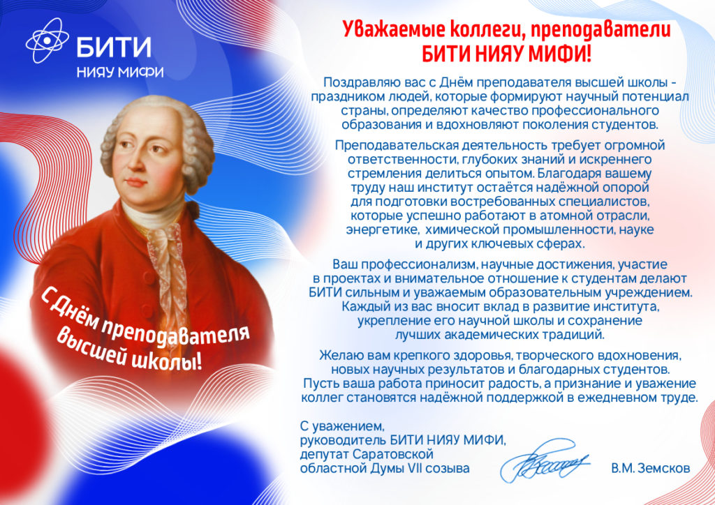 РУКОВОДИТЕЛЬ БИТИ НИЯУ МИФИ ЗЕМСКОВ В.М. ПОЗДРАВЛЯЕТ С ДНЁМ ПРЕПОДАВАТЕЛЯ ВЫСШЕЙ ШКОЛЫ! 19.11.2025 Просмотров: 152