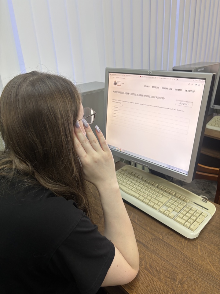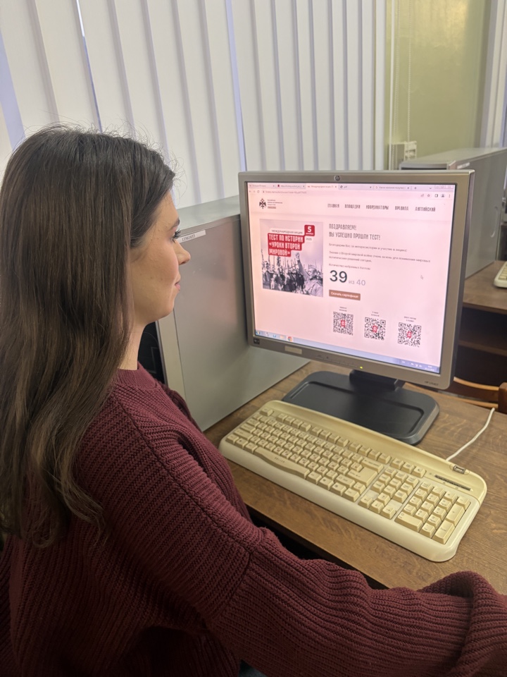 В этом значимом гражданско-патриотическом мероприятии, нацеленном на образовательно-просветительское развитие молодёжи и способствующем утверждению действительной истины о решающей роли народов Советского Союза в победе над фашистским агрессором, приняли заинтересованное участие студенты и преподаватели вуза. Тестирование на официальной онлайн-площадке акции, организованное кафедрой «Гуманитарные дисциплины» в лице её заведующего Михайловой О. Н. и старшего преподавателя Толок Е. С., прошли более 100 участников. Они проявили историческую компетентность в анализе предложенных заданий о событиях и уроках Второй мировой войны. Неравнодушная оценка историко-военной правды противостояния фашизму, являющейся основой для диалога между странами, пережившими эту трагедию, стала данью памяти и уважения беспримерному мужеству и самопожертвованию тех, кто отстоял мирную свободу и обеспечил возможность жить и строить будущее.