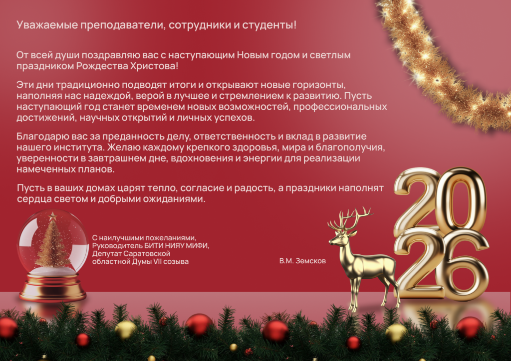 РУКОВОДИТЕЛЬ БИТИ НИЯУ МИФИ ЗЕМСКОВ В.М. ПОЗДРАВЛЯЕТ С НАСТУПАЮЩИМ НОВЫМ ГОДОМ И СВЕТЛЫМ ПРАЗДНИКОМ РОЖДЕСТВА ХРИСТОВА! 30.12.2025 Просмотров: 178