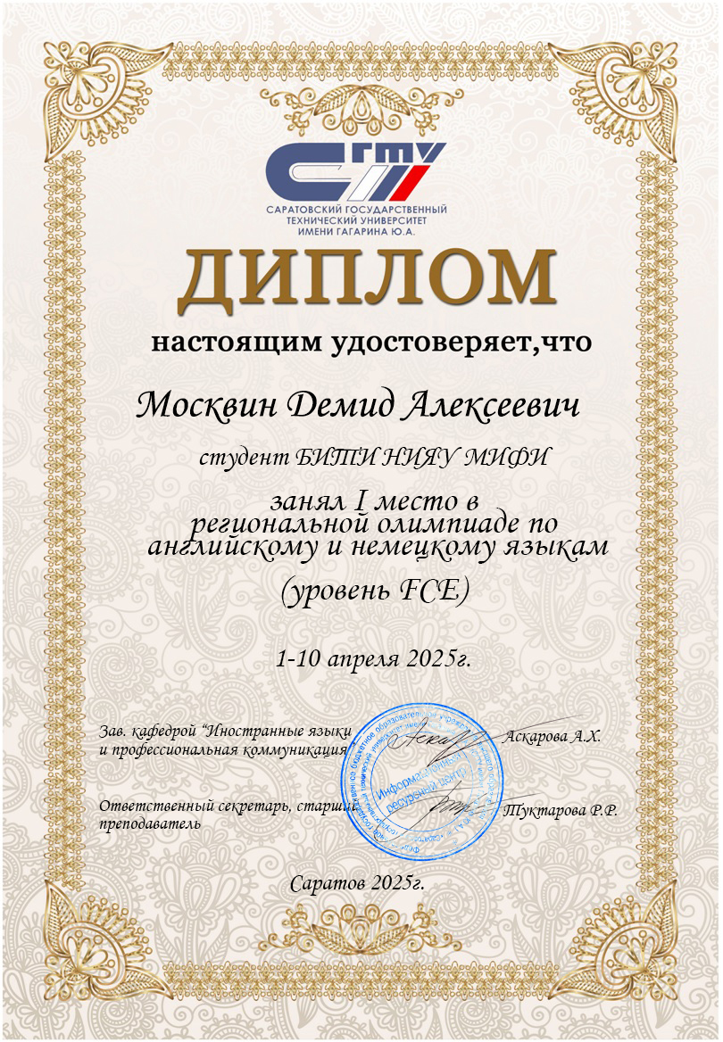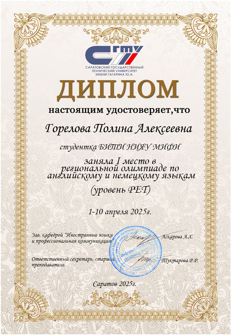 Для эффективного взаимодействия между людьми необходимо наличие основного способа коммуникации - языка. Свободное владение английским языком предоставляет возможность профессионального и личного общения с носителями языка. Повысить интерес к английскому языку и усовершенствовать его знание мне помогли высококвалифицированные преподаватели БИТИ НИЯУ МИФИ при обучении по программе "Переводчик в сфере профессиональной коммуникации". Надеюсь, что владение английским языком даст мне возможность работать с представителями международных корпораций.